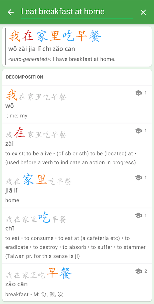 - When typing an English sentence into the search box (at least 4 words), instead of showing “no english matches”, you see the auto-generated Chinese translation (using on-device Google Translate) together with pinyin and sentence decomposition.