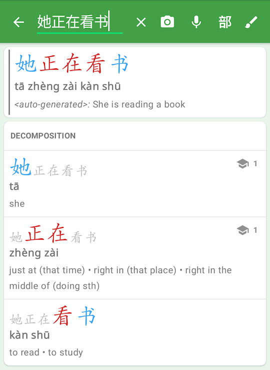 - When typing a Chinese sentence into the search box (at least 4 characters), instead of showing “unknown meaning”, you see the auto-generated English translation (using on-device Google Translate) together with sentence decomposition.